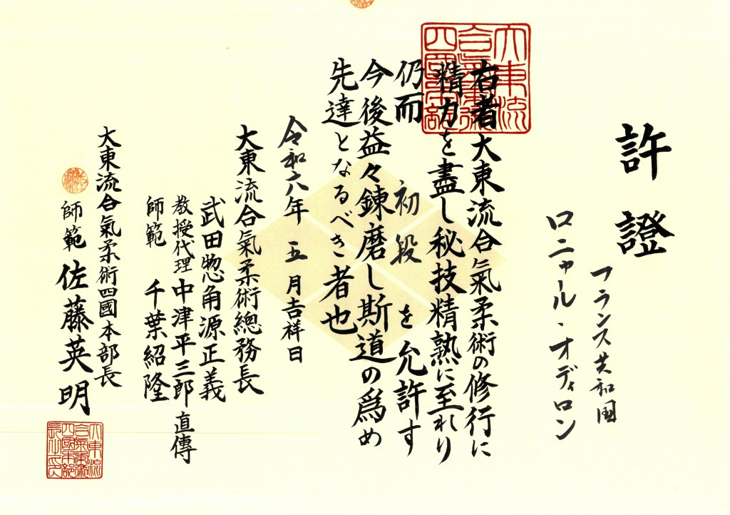Odilon étudie également le Daïto-ryu Aïki Jujutsu au Shikoku Hombu Dojo, où il a reçu le 1ᵉʳ dan.