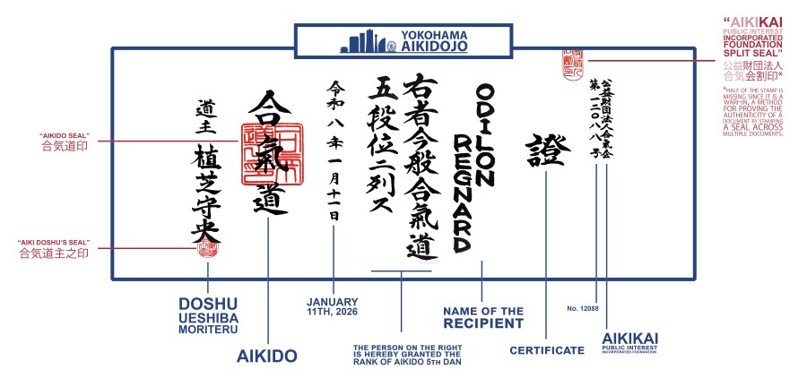 Depuis plus de dix ans, Odilon se rend chaque année au Japon pour s’entraîner au Hombu Dojo et au Yokohama AikiDojo. Il détient de ce dernier le titre de shidoin (enseignant) et prend en charge certains cours lors de ses séjours. Scellant cette relation privilégiée avec le Japon, il a été recommandé au 5ème dan par Guillaume Erard et a reçu le diplôme signé par le Doshu suite au Kagamibiraki 2026.